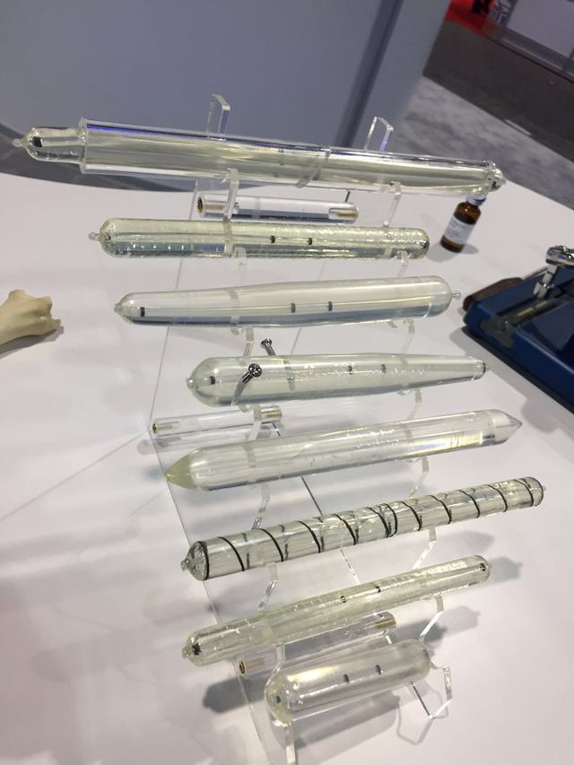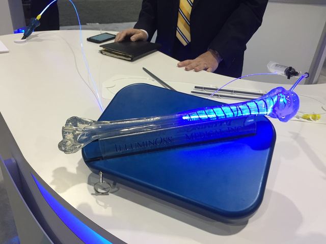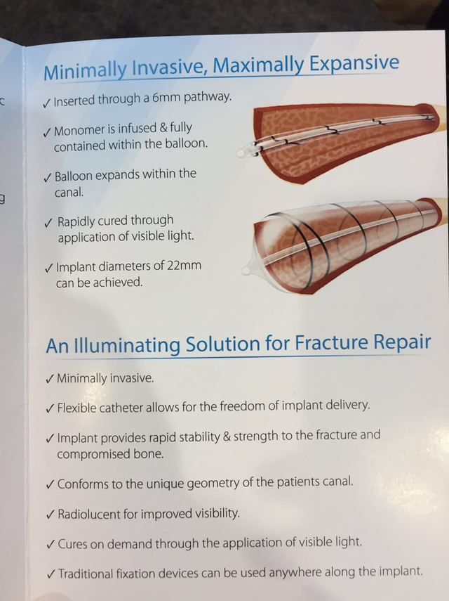 美国骨科医师学会(AAOS)2015 年会 3 月 24 日-28 日在拉斯维加斯召开,25 日开始展厅开放,闲逛中也有一些有意思的发现,一一与大家分享。这里要说的是一种球囊扩张髓内固定系统:Photodynamic Balloon Stabilization System(光动态球囊稳定系统)。置入体内之前与 PKP 用到的球囊很像,条状,柔软,非金属,插入髓腔,到达理想位置以后,注射器推注水全髓腔膨胀,并与髓腔内壁贴合,硬度强化,获得稳定的固定。